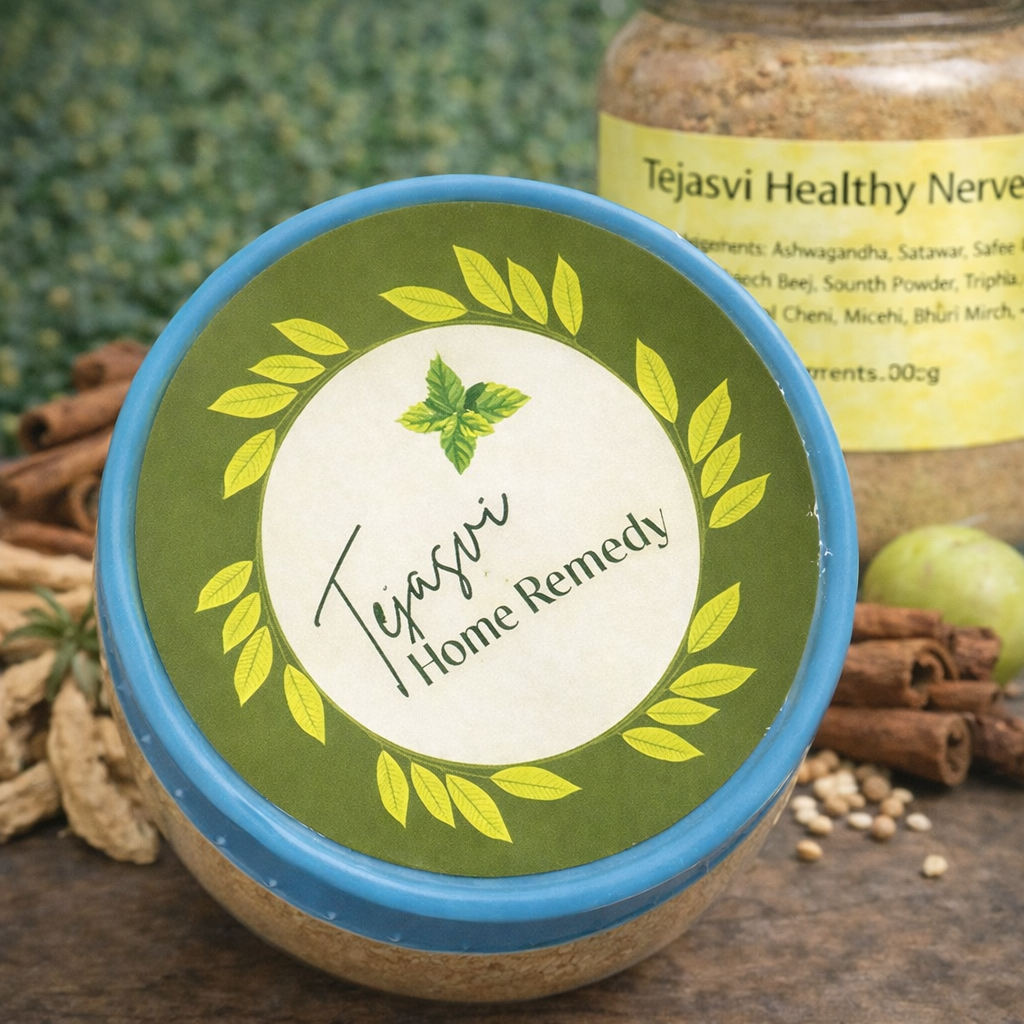 Tejasvi Healthy Nerves is a carefully prepared herbal home remedy made with time-tested Ayurvedic ingredients that help nourish and support the nervous system. This formulation is designed to promote nerve strength, improve mental balance, and help the body cope with daily stress and fatigue.