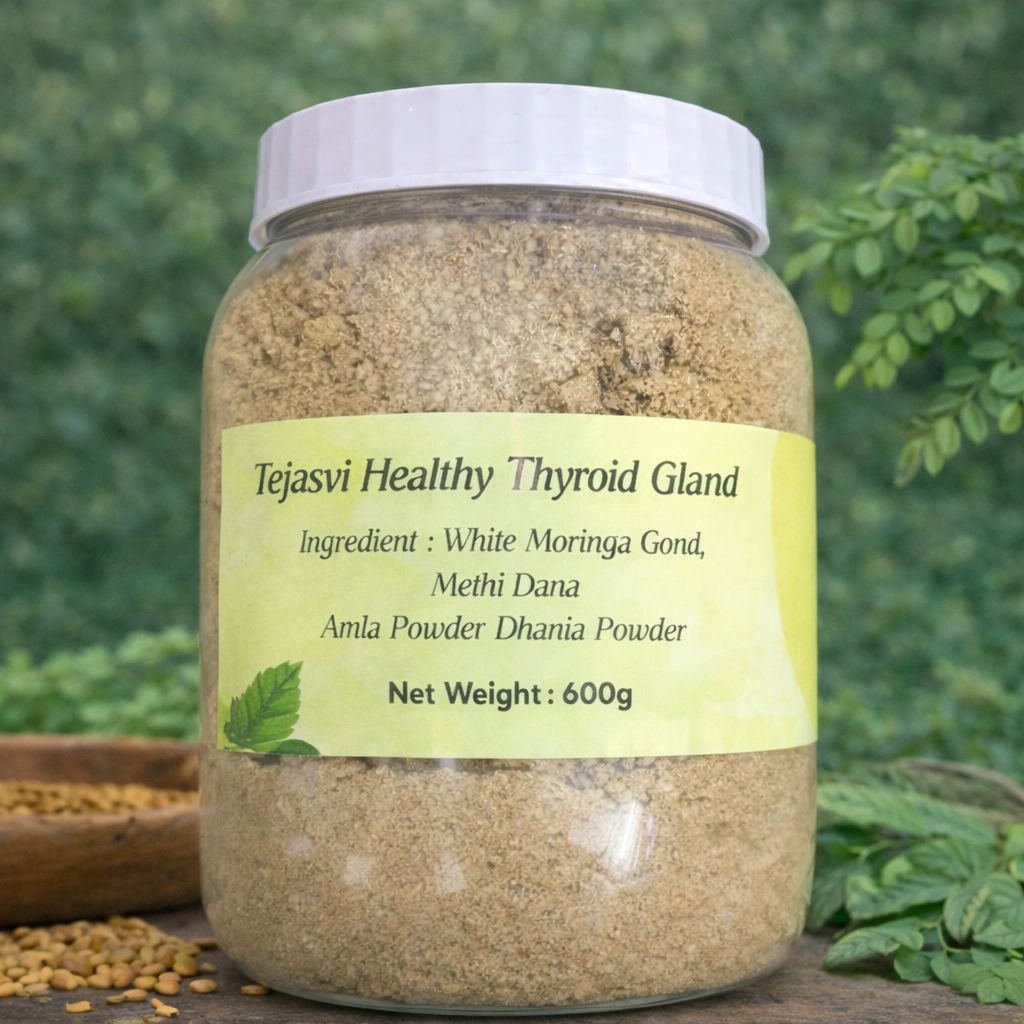 Tejasvi Healthy Thyroid Gland is a thoughtfully prepared herbal formulation rooted in traditional wellness practices. It is made using natural ingredients such as White Moringa Gond, Methi Dana Amla Powder and Dhania Powder, known in Ayurveda for supporting general health and vitality.